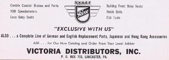 Short History of Rixe and Co.Winter, 1920. Locksmiths August Rixe and Robert Meyer establish the Rixe & Meyer machine and bicycle factory.January 24, 1921. Rixe and Meyer officially registered as a limited company in Bielefeld to make and sell machinery, bicycles and bicycle parts. August Rixe provided the building and equipment. Bielefeld was a major manufacturing center for two wheelers second only to Nuremberg. Bastert, Duerkopp, Goebel, Goricke, Miele, Rabeneick and Rixe were some of the big manufacturers in Bielefeld. In 1954 the manufacturers from Bielefeld produced almost half the bikes in Germany and 86% of the mopeds. In the beginning. Rixe produced parts for other manufacturers in Beilefeld such as Duerkopp and Goricke. 1923. They began making their own bicycles under the name Rico. 1924. They changed the name to Rixe & Co. and expanded the workshop. With the expanded facilities the company focused on building their own bicycles but still continued to build frames and components for other manufacturers. 1926. August Rixe dies and his wife Anna Rixe becomes the managing director. She gives 50% of the shares in Rixe & Co to Henry Oberschelp. 1929. The worldwide economic crises took it's toll on many manufacturers in Germany and across the world. Rixe survived but had to cut their workforce. 1935. Rixe started making motorized two wheelers in addition to bicycles. December 1939. Rixe is required to make war machinery. They are permitted to continue producing a small amount of civilian products. 1941. Rixe was assigned Eastern European forced laborers - some of which were POWs. 1943. They built barracks to accommodate the Eastern European laborers. It is unknown if the forced laborers were paid. By the end of the war they had 137 of these laborers. September 30, 1944. Bombing raids largely missed the Rixe production facilities but the air raid on Novemeber 23, 1944 hit the tool shop in Plant II and reduced production significantly. April 1, 1945. The Americans took Beilefeld. September 1945. Bicycle production resumes. November 1945. Rixe is forbidden to produce bicycles and motor vehicles due to lack of energy/coal. They continue to produce parts. 1946. Bicycle production resumes. 1948. Motorcycle production resumes in limited numbers. Mid-50s to early 60s. Victoria Distributors, Lancaster, PA, imported Rixe bicycles into the US. The president of Victoria Distributors, Earnest Ryersbach, was of German extract. An American Bicyclist Magazine ad shows Rixe bicycles were still imported as late as January 1964. West Coast Cycle Supply Co of Los Angeles sold some racing and tandem models imported from Victoria Distributors. 1950's. Ted Earnst, of Bicycle Super Mart-Manhattan Beach, CA, raced on Rixe bikes in Chicago. 1984. Rixe was sold and production was moved to China.